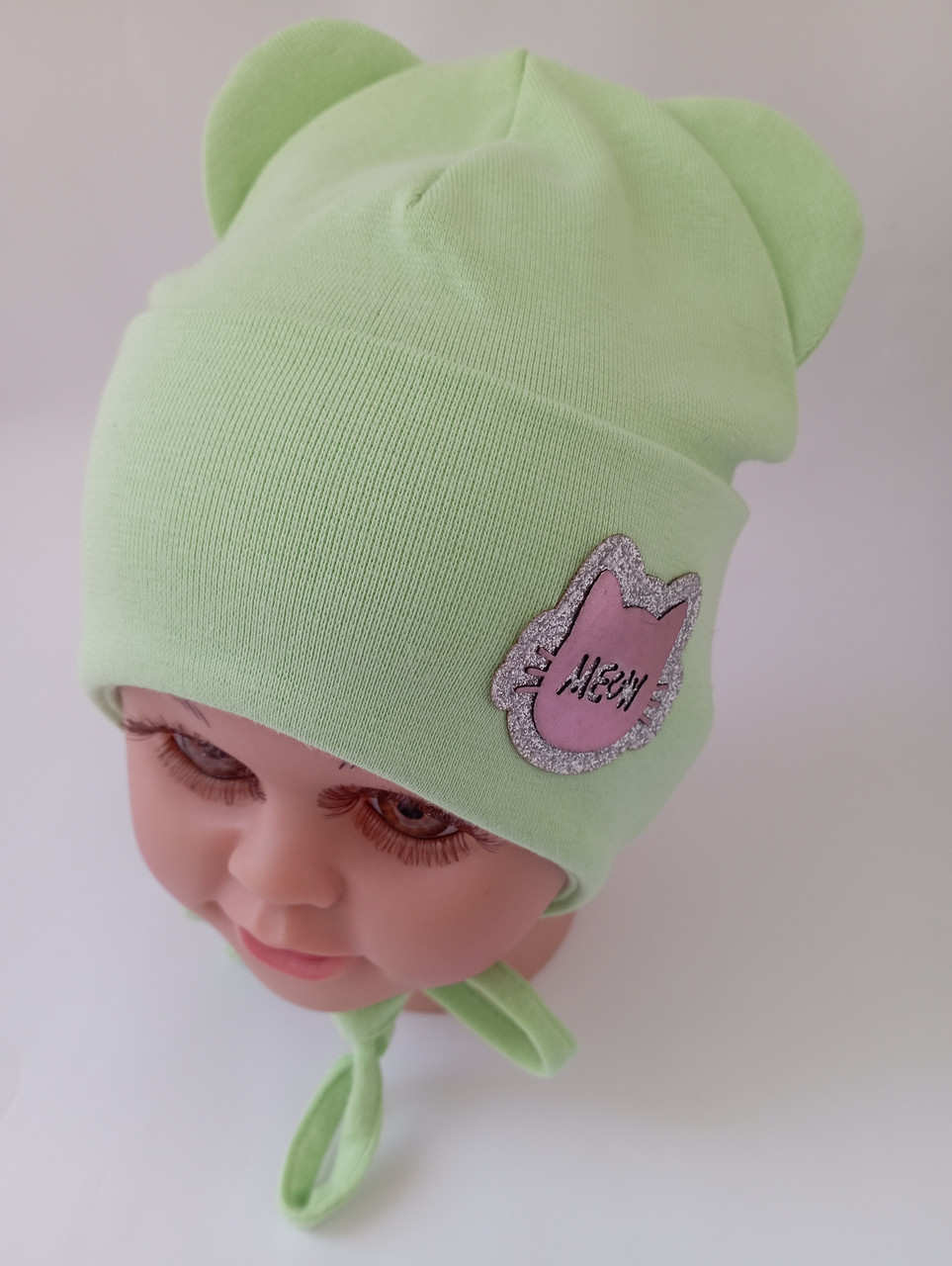 Трикотажна шапка з подвійним закотом на зав'язках добре прилягає до обличчя дитини.