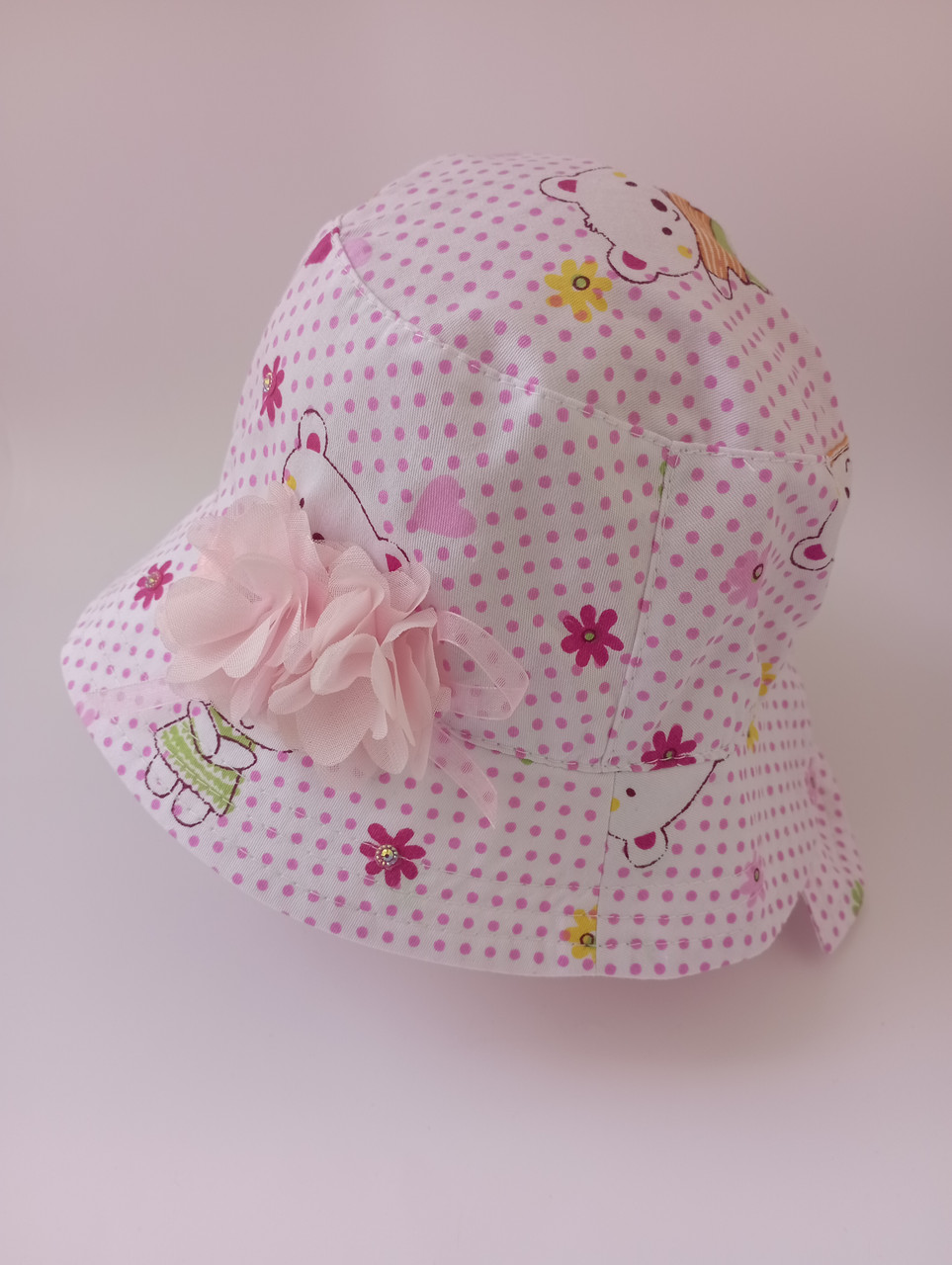 Панама для дівчинки прикрашена квітковою композицією з тканини, намистинами, стразами